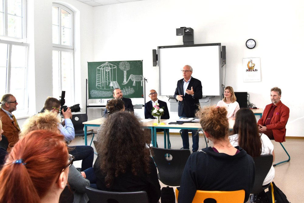 Der vorgesehene Unterrichtsraum für die Vertragsunterzeichnung war schnell gut besucht. Presse, Mitarbeiter, geladene Gäste und natürlich auch unsere interessierten angehenden Erzieherinnen und Erzieher füllten den Raum schneller als gedacht.