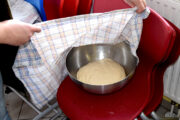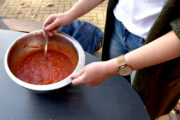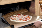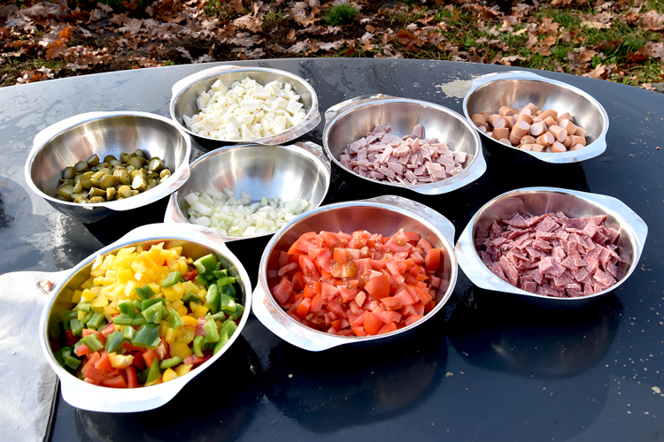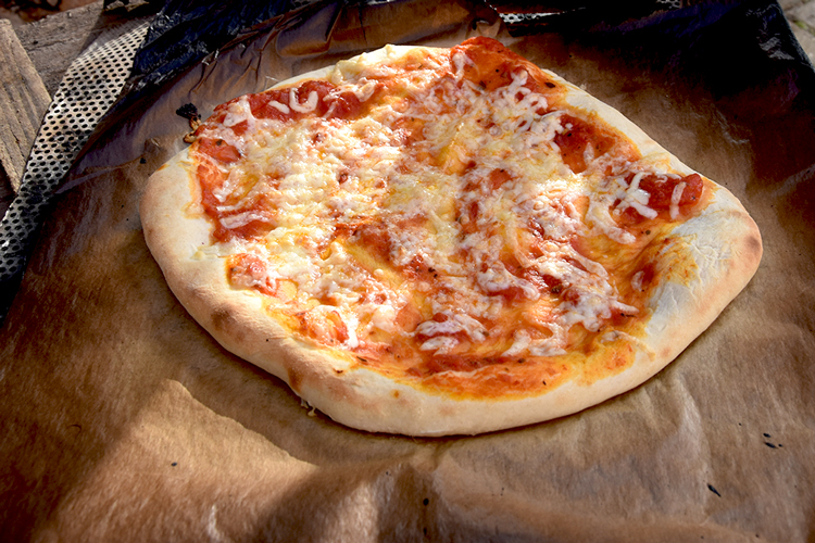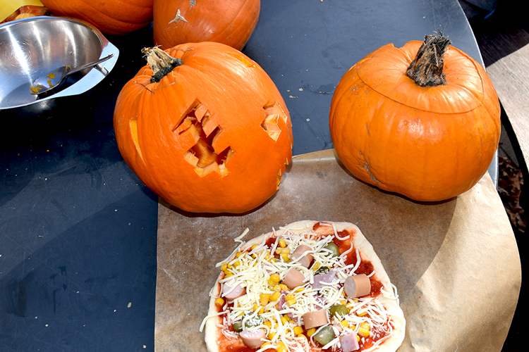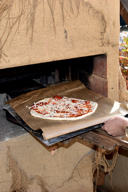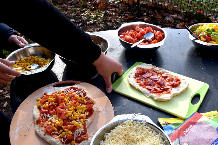 Um 10 Uhr fanden sich alle wieder zusammen und es ging prompt an die Vorbereitungen. Es wurde geschnippelt, was das Zeug hält. Neben den Klassikern Salami und Schinken gab es auch Würstchen und Gewürzgurken oder für die, die es lieber vegetarisch mochten, Paprika, Tomate und Feta – es war für jeden Geschmack der passende Belag dabei. Nachdem der Pizzateig gut durchgeknetet war und einige Zeit geruht hatte, die selbstgemachte Pizzasauce angerührt und durchgezogen war, ging es munter ans Ausrollen und Belegen. Danach ging es mit viel Gefühl in den heißen Lehmofen. Es dauerte nicht lange, bis der Duft von frisch gebackener Pizza die Luft erfüllte. Nach 5–6 Minuten waren die Pizzen fertig – jede so individuell, wie das Kind, das sie belegt hatte und alle mega lecker!
